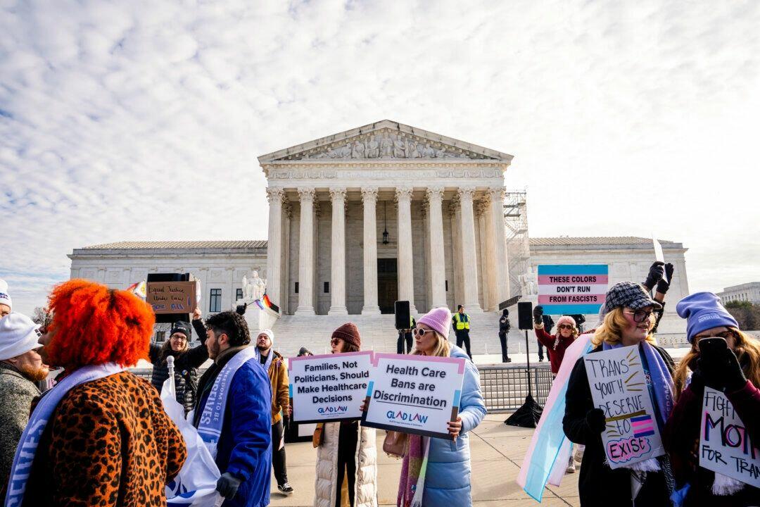 Protesters in front of the Supreme Court as the high court hears a case over banning gender procedures for minors, in Washington on Dec. 4, 2024. Madalina Vasiliu/The Epoch Times