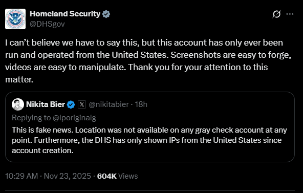 DHS responded swiftly, insisting the account “has only ever been operated from the United States” and implying the screenshots were fabricated. X Head of Product Nikita Bier amplified the denial, labeling the claims “fake news.”