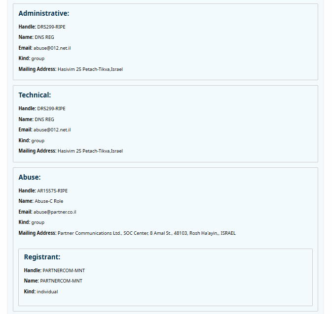 Yet the account’s original registration IP from 2008-212.199.163.42-still resolves today to Partner Communications Ltd., an Israeli telecommunications provider headquartered in Rosh HaAyin, minutes from Tel Aviv.