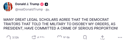 In a separate post, Trump noted, “MANY GREAT LEGAL SCHOLARS AGREE THAT THE DEMOCRAT TRAITORS THAT TOLD THE MILITARY TO DISOBEY MY ORDERS, AS PRESIDENT, HAVE COMMITTED A CRIME OF SERIOUS PROPORTION!”