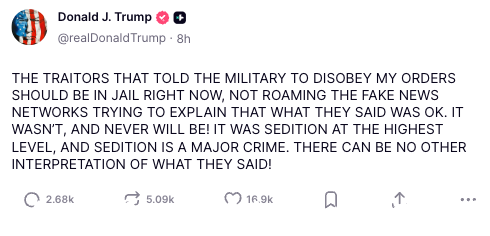 In a separate post, Trump noted, “MANY GREAT LEGAL SCHOLARS AGREE THAT THE DEMOCRAT TRAITORS THAT TOLD THE MILITARY TO DISOBEY MY ORDERS, AS PRESIDENT, HAVE COMMITTED A CRIME OF SERIOUS PROPORTION!”
