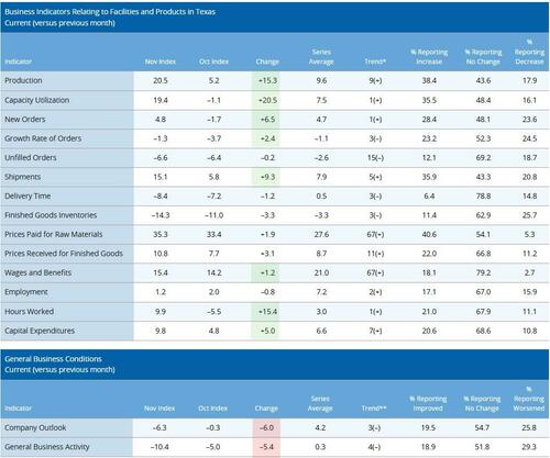 In pictures, it looks like this: Texas manufacturers are pumping production higher (and expect more in the future) but their headline sentiment above business activity is tumbling to its lowest since June…