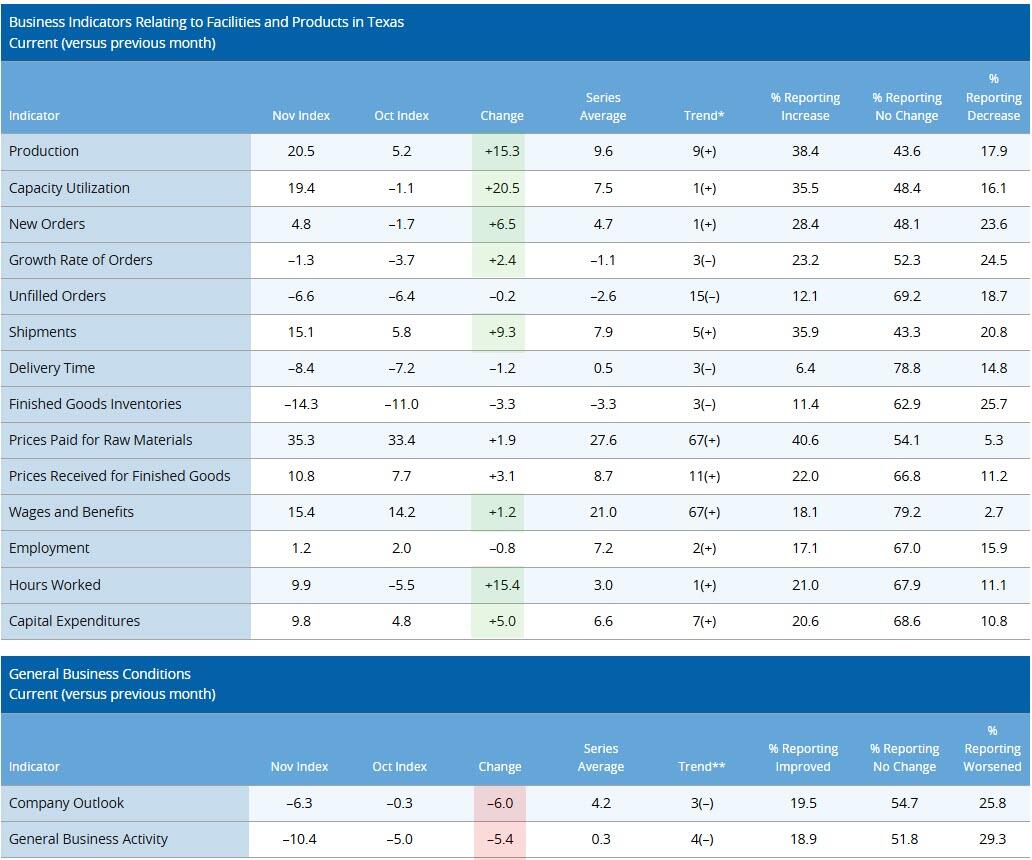 Texas factory activity expanded at a markedly faster pace in November, according to business executives responding to the Texas Manufacturing Outlook Survey.