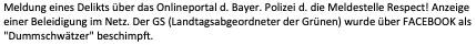 Translation via ChatGPT: “Report of an offense via the online portal of the Bavarian Police through the reporting office REspect! Reporting an online insult. The GS (Green Party member of the state parliament) was called a ‘Dummschwätzer’ (‘blabbermouth’ / ‘loud-mouthed idiot’) on Facebook.”