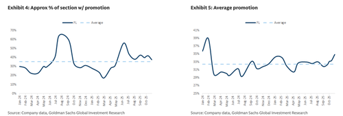 In men’s, we estimate that 34% of Nike footwear was on sale with an average promotion of 32%, compared to 21% of Adidas footwear with an average promotion of 33% and 38% of New Balance footwear with an average promotion of 42%. In women’s, we estimate that 30% of Nike footwear was on sale with an average promotion of 34%, compared to 57% of Adidas footwear with an average promotion of 32% and 45% of New Balance footwear with an average promotion of 37%.