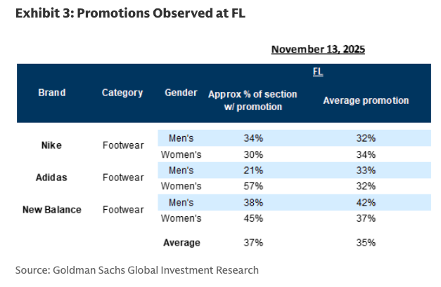 In a recent channel check, Goldman analysts led by Kate McShane visited a Foot Locker store in Jersey City, New Jersey, and found light traffic and elevated promotions.