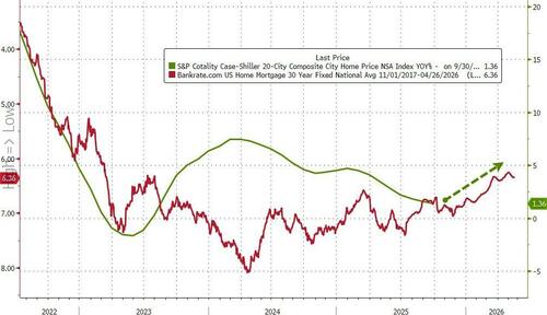 US home prices in the 20 largest cities rose 0.13% MoM in September (very slightly better than the 0.1% rise expected) and up for the second month in a row (after falling for five straight months before). This MoM rise left the average priers up just 1.36% YoY – the lowest since July 2023…