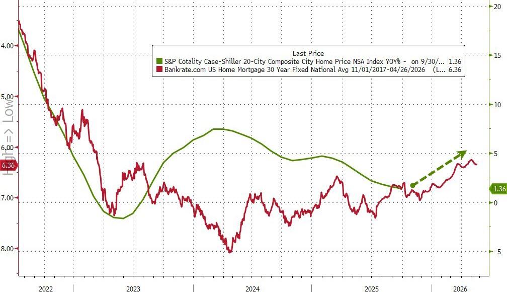 US home prices in the 20 largest cities rose 0.13% MoM in September (very slightly better than the 0.1% rise expected) and up for the second month in a row (after falling for five straight months before). This MoM rise left the average priers up just 1.36% YoY – the lowest since July 2023…