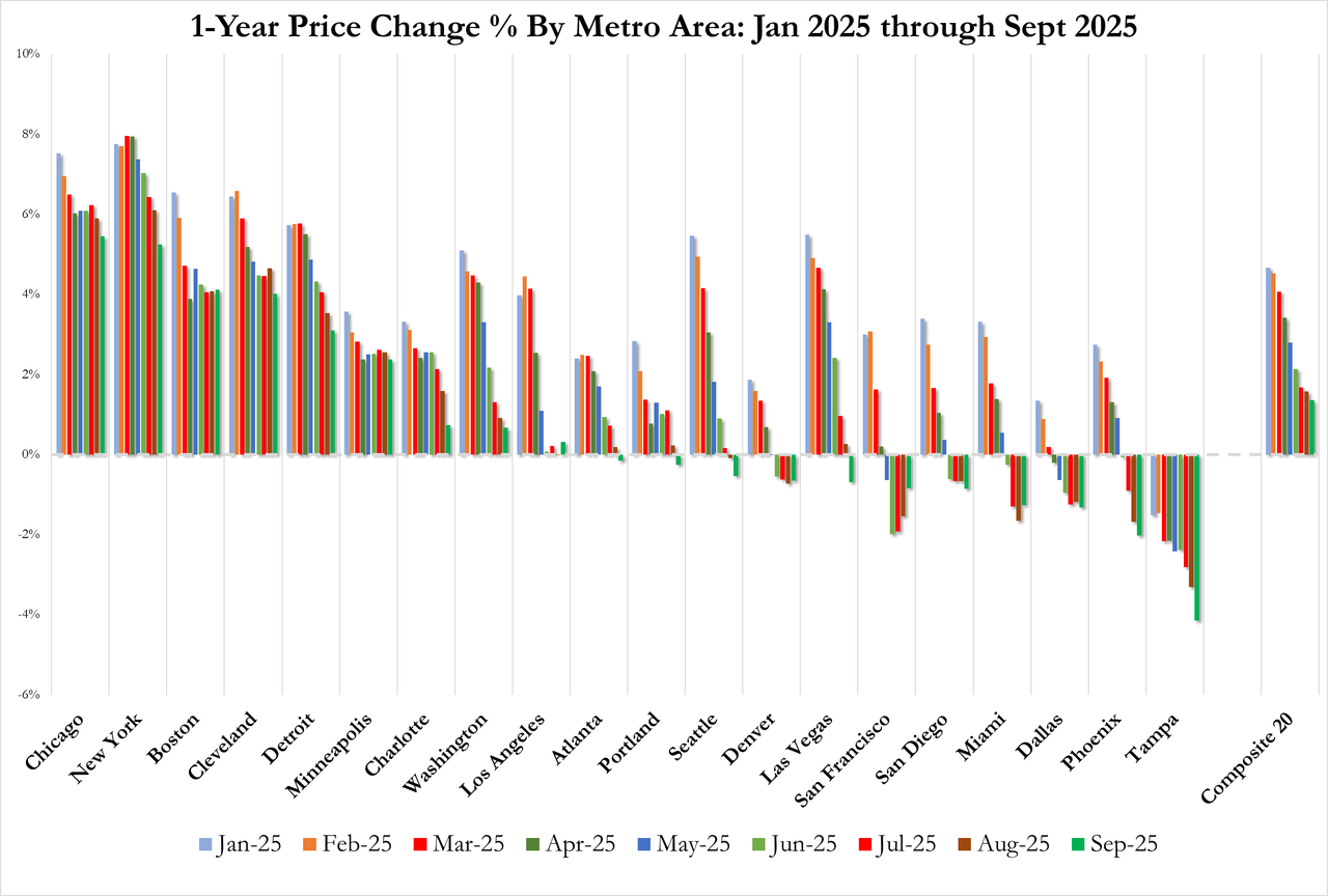 At the opposite extreme, Tampa posted a 4.1% annual decline – the sharpest drop among tracked metros and its 11th consecutive month of negative annual returns. Phoenix (-2.0%), Dallas (-1.3%), and Miami (-1.3%) likewise remained in negative territory, highlighting particular weakness in Sun Belt markets that experienced the most dramatic pandemic-era price surges.