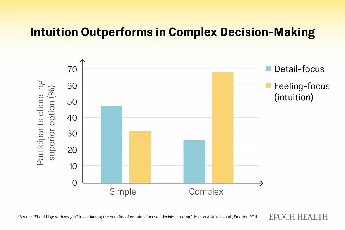 Yet, this kind of intuitive, rapid processing isn’t limited to professional skills. Going with your gut may be especially true in complex situations in your own life. Research shows that when people face complex decisions, such as selecting a home or making major life choices, those who focus on their feelings rather than painstakingly analyzing every detail often make better decisions and, perhaps even more importantly, are more satisfied with the outcome.