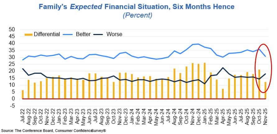 Consumers were notably more pessimistic about business conditions six months from now. Mid-2026 expectations for labor market conditions remained decidedly negative, and expectations for increased household incomes shrunk dramatically, after six months of strongly positive readings.”