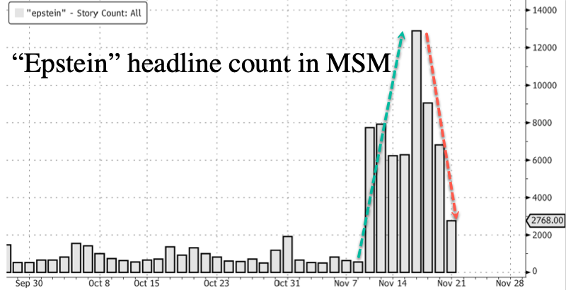 According to Bloomberg data, the headline count in MSM for “Epstein” erupted on the day when President Trump signed a spending bill to reopen the federal government after Democrats caved. This was nothing more than a headline deflection by Democrats.