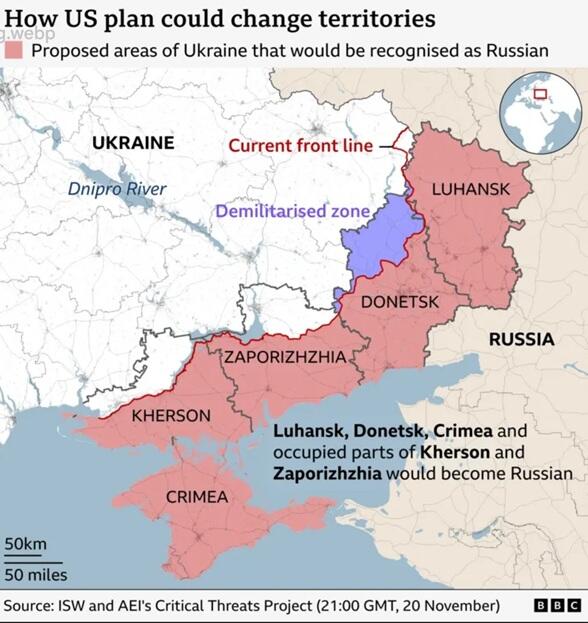 Map from BBC showing proposed territorial concessions, but which Zelensky has viewed negatively in terms of inclusion in a final peace deal: