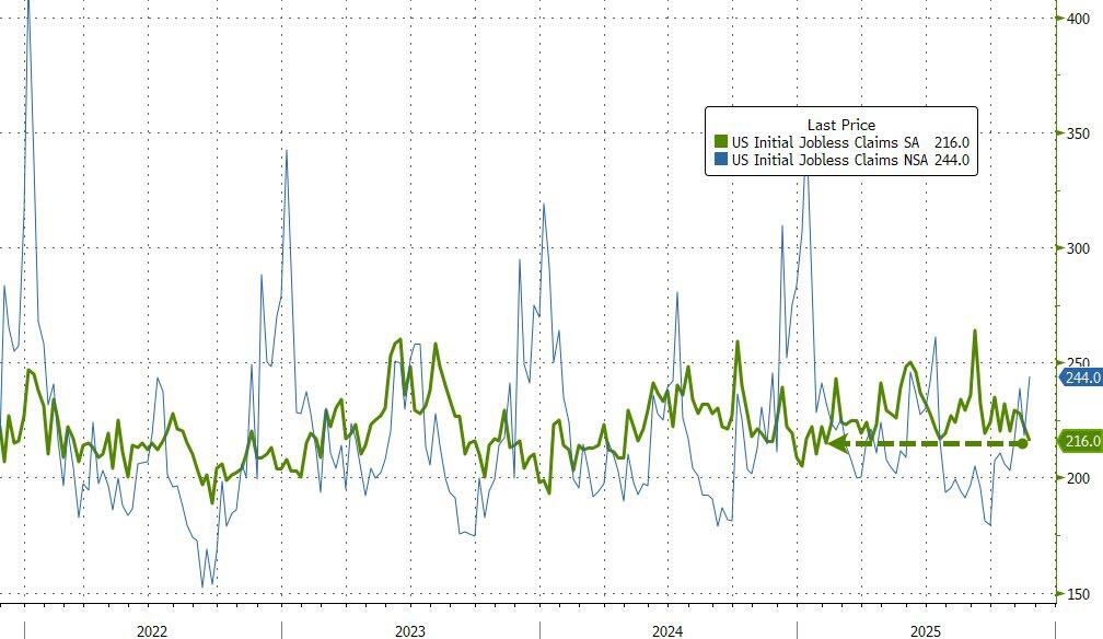 The number of Americans filing for jobless benefits for the first time tumbled to just 216k last week – the lowest since April