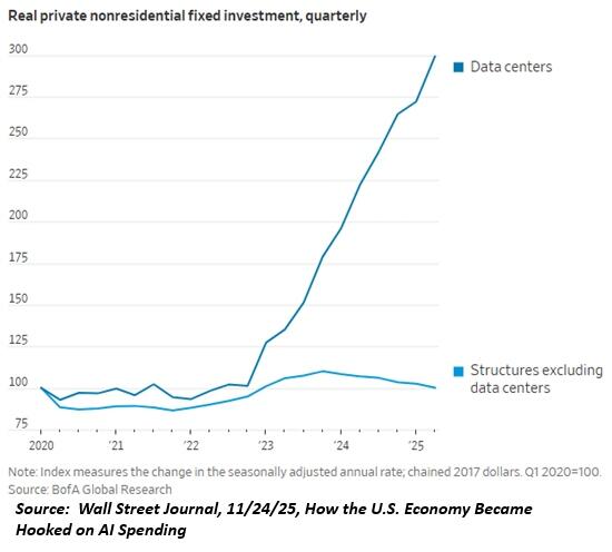 The middle class is cracking, and the Everything Bubble hasn’t even started to pop yet; once it does, job losses will accelerate due to the self-reinforcing nature of job losses reducing income and spending which then triggers more job cuts. How the U.S. Economy Became Hooked on AI Spending: Growth has been bolstered by data-center investment and stock-market wealth. A reversal could raise the risk of recession.
