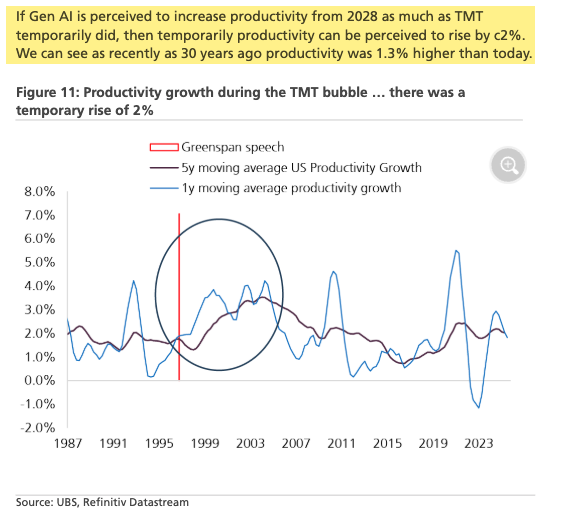 UBS analyst Andrew Garthwaite wrote that his bullish target for the MSCI AC World is 1,090 by end-2026 (+11%). But he noted that if GenAI delivers even half the productivity surge that late-1990s Tech was believed to produce, the S&P 500 could “easily” justify 7,000.