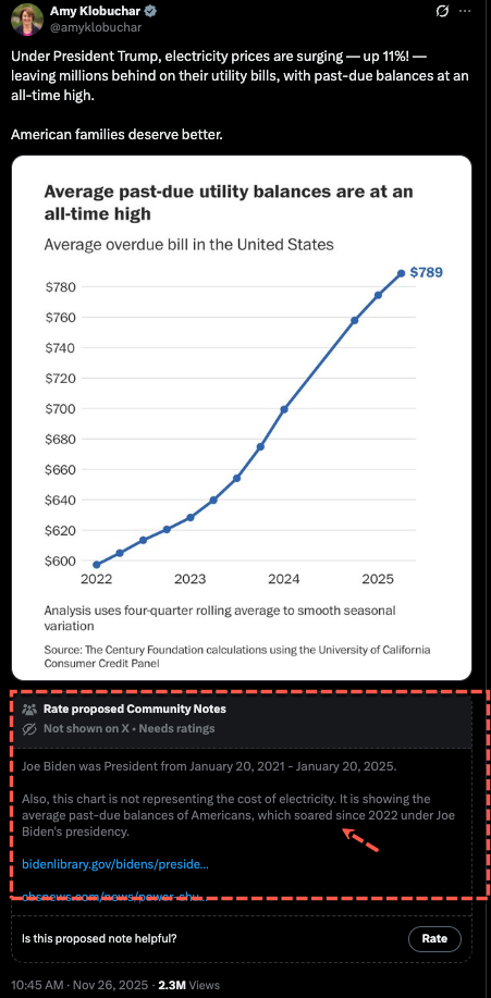 Klobuchar’s X post attempted to blame the entire power bill crisis on President Trump, with a graphic showing a parabolic line rising to the right that would alarm anyone.