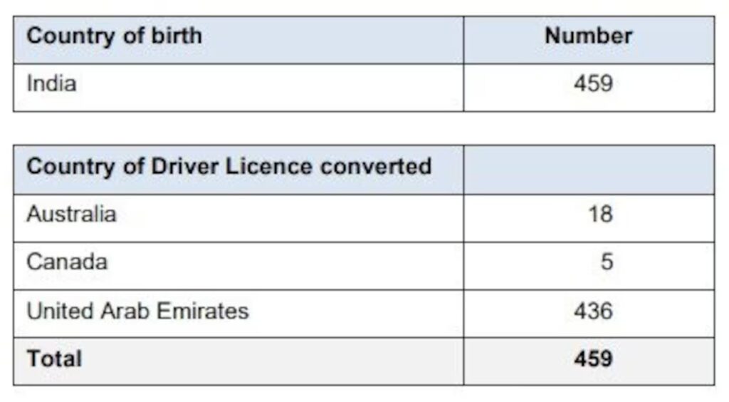 An Official Information Act (OIA) request found all 459 foreign truck drivers were born in India, but no conversions were from Indian licences. The data showed that 436 were converted from the United Arab Emirates, 18 were from Australia, and five were from Canada.