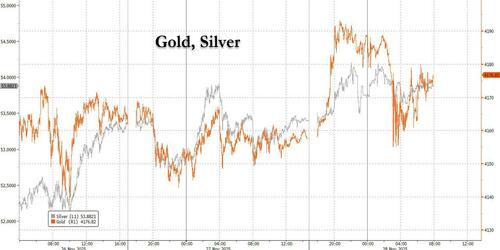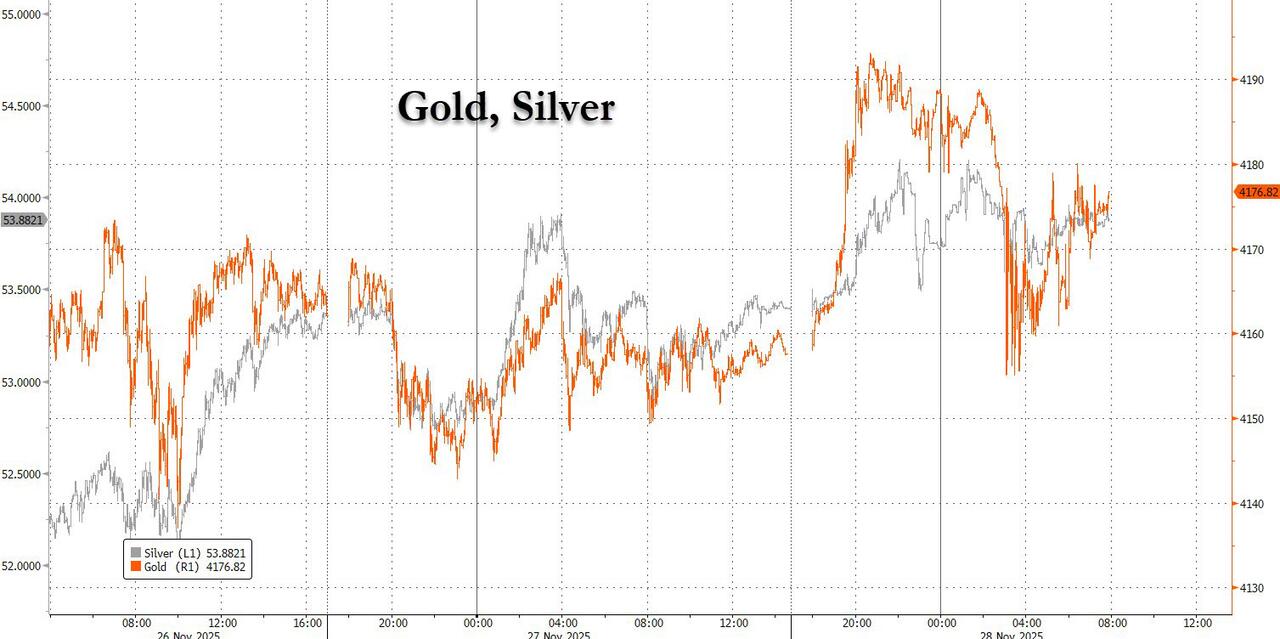 Normally, this is where we would tell you where US index futures are trading early in the morning, we can’t because at 9:45pm ET on Thursday, the CME experienced a catastrophic “glitch” and all equities, treasuries, FX and commodities futures went dark as a result of a what the Chicago Merc Exchange said was a cooling system malfunction at its Chicago data center operated by CyrusOne. While the CME since restarted its EBS market, a platform used in foreign exchange, at noon London time, its major global futures markets from equities to bonds and commodities are still down. When the cash market opens, both the S&P 500 and Nasdaq 100 will look to extend a four-day winning streak driven by growing confidence that the Fed will cut interest rates next month. Elsewhere, European bourses are mostly flat, with the FTSE 100 (+0.1%) the only major index posting gains. Overall market action is muted amid light news flow, reflecting both Thanksgiving and the CME issues. The Dollar is firmer within a 99.50–99.75 range, having found support at the half-round figure and pushed above Thursday’s 99.71 peak. European bonds are a little softer post-data; the EUR dipped during the releases but has since bounced off lows. Crude oil traded modestly higher, extending the prior session’s gains, although WTI trading was later halted due to the CME outage. Looking ahead, highlights Canadian GDP (Q3), German Nationwide HICP, Credit Review for France. Today is a shortened US session, with markets set to close just after noon ET.
