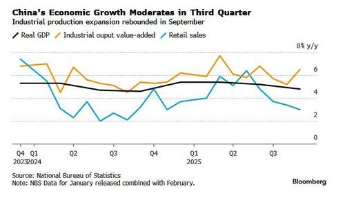 As Bloomberg notes, the recent downswing in the economy doesn’t mean that additional stimulus measures are on the table. Chinese policymakers are in no rush to act now that their annual growth target of around 5% for this year looks to be within reach. Meanwhile, China’s credit growth – previously the envy of the western world – has slowed to a trickle as the demand simply isn’t there, as Beijing is scared to making China’s massive debt bubble even bigger.