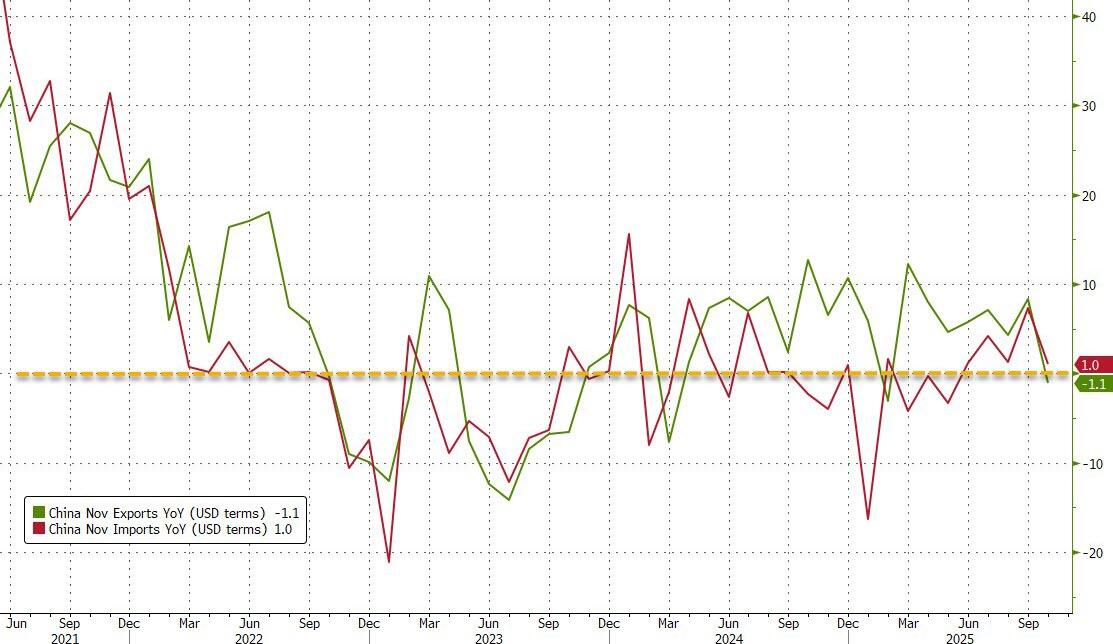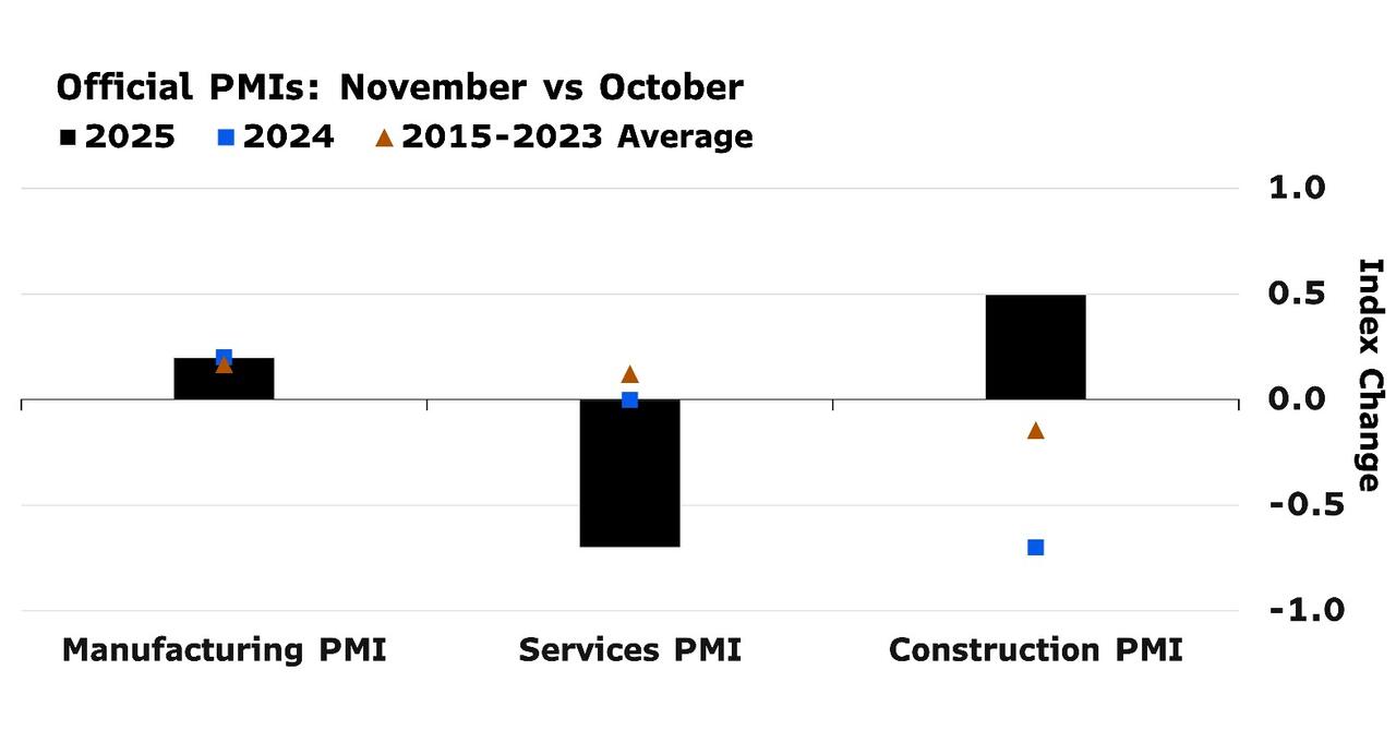 According to Bloomberg Economics, the November PMI pointed to continuing broad economic weakness and hinted at a further down-drift in consumption. Services dropped sharply into contraction, a stark contrast to the flat reading in 2024 after the long October holiday. Manufacturing and construction also remained in contraction, despite a modest seasonal rebound.