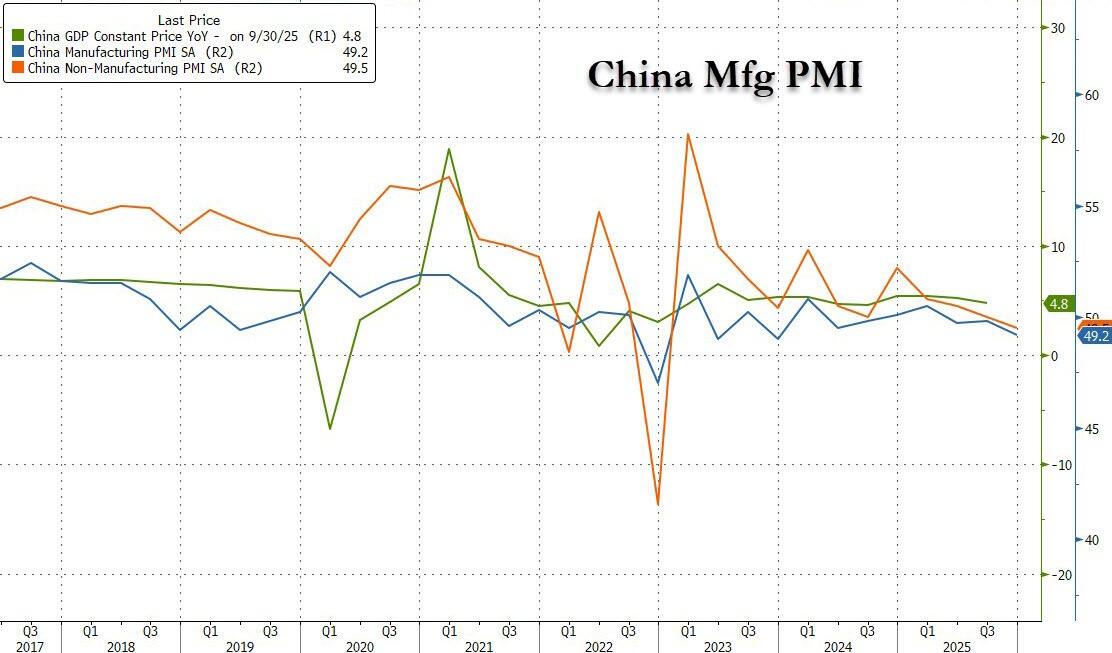 Adding insult to injury, the official non-manufacturing PMI fell to 49.5 from 50.1, below the 50.0 consensus forecast, and dropping into contraction for the first time since the economy reopened in 2023l it was driven by weakness in the real estate and residential services sectors.