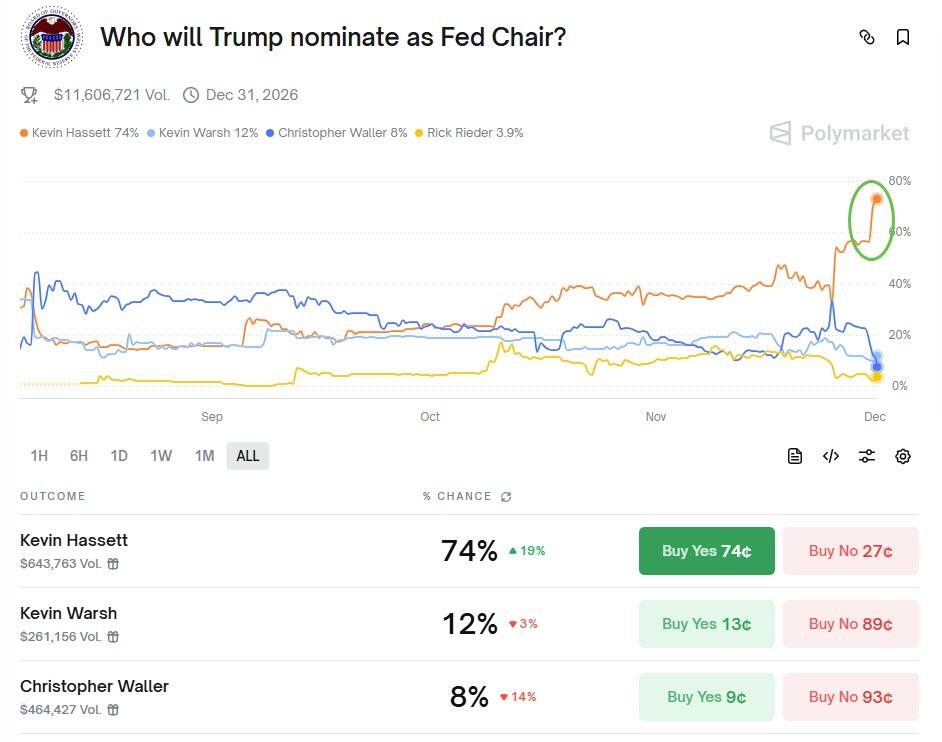 Hassett now has an 75% chance of getting the nomination according to prediction market Polymarket. Former Fed Gov. Kevin Warsh is at 12% with Fed Gov. Christopher Waller down to 8%.