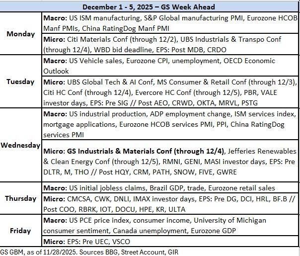 - 10:00 AM ISM manufacturing index, November (GS 49.0, consensus 49.0, last 48.7): We estimate that the ISM manufacturing index rebounded 0.3pt to 49.0 in November, reflecting slight improvement in our manufacturing survey tracker (+0.1pt to 51.6).