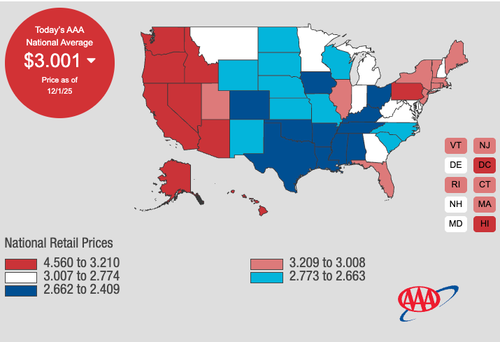The latest data from the American Automobile Association shows the national average price for regular gasoline has fallen to a more than four-year low of $3.001 as of Monday.