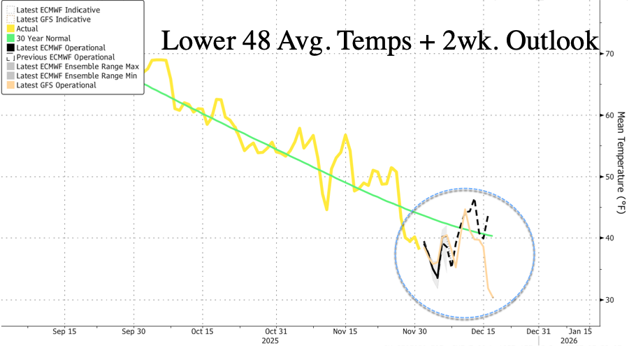 NatGas futures are on track for their largest quarterly gain since the first quarter of 2022. Prices on Tuesday morning were trading near $5 per mmbtu, the highest level since December 2022. The rally is being fueled by a rapid shift toward colder early-December temperatures across the Midwest and East, which has boosted heating demand expectations.