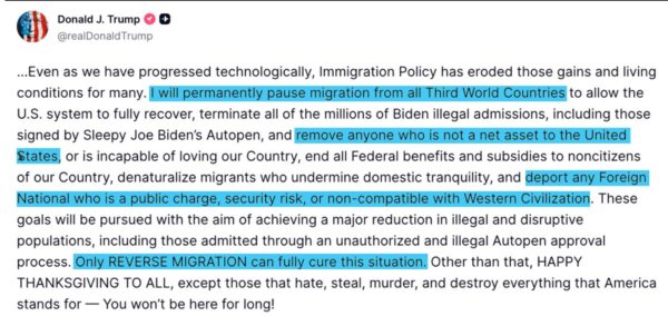 On Thanksgiving Day, after an Afghan opened fire on National Guardsmen in Washington, Donald Trump unleashed a mighty blast against immigrants that ended with these words: “I will permanently pause migration from all Third World Countries . . . and remove anyone who is not a net asset to the United States . . . deport any Foreign National who is a public charge, security risk, or non-compatible with Western Civilization. . . . Only REVERSE MIGRATION can fully cure this situation.”