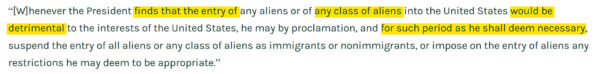 For now, he’s operating under Section 212(f) of the Immigration and Nationality Act, that says if the President “finds that the entry of . . . any class of aliens into the United States would be detrimental” he can keep them out “for such period as he shall deem necessary.”
