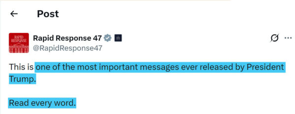 But even though the White House “Rapid Response” account said it was “one of the most important messages ever released by President Trump” — and added “Read every word” — his message didn’t raise much of a stink, for reasons both good and bad.