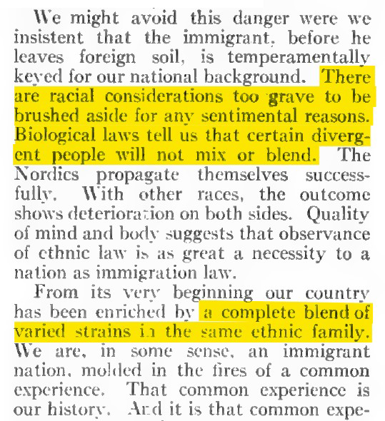 “There are racial considerations too grave to be brushed aside for any sentimental reasons. Biological laws tell us that certain divergent people will not mix or blend.” He called the United States “a complete blend of varied strains in the same ethnic family.”