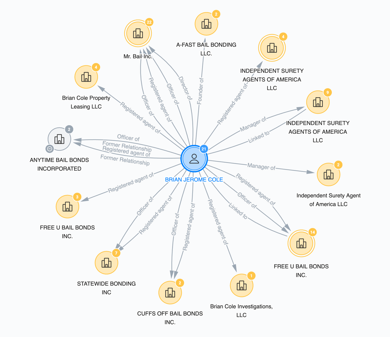 Public records indicate that Brian Cole is connected to a wide network of bail-bonds companies.