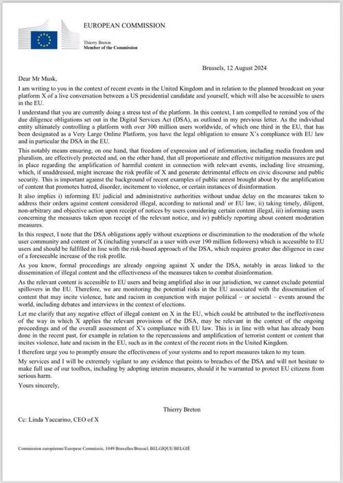 Further, Musk brings receipts showing the European Union sent him a formal letter demanding that he censor Donald Trump during the 2024 US presidential election.