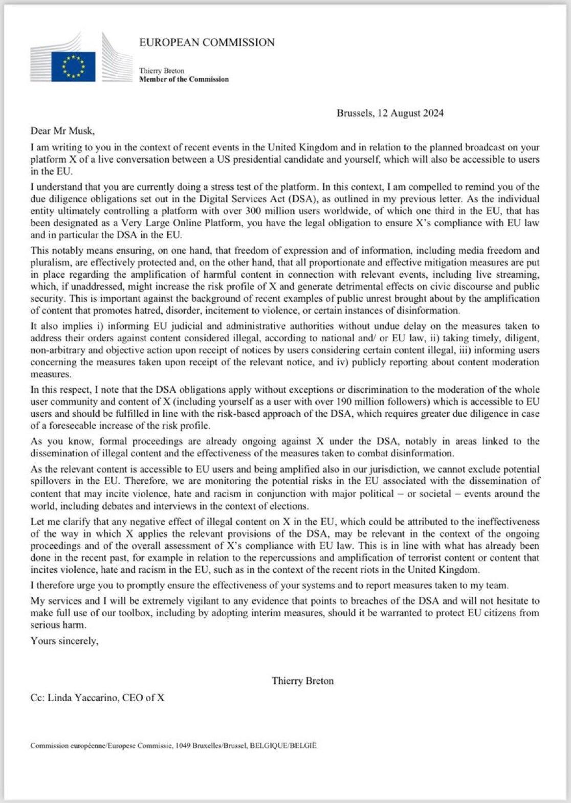 Further, Musk brings receipts showing the European Union sent him a formal letter demanding that he censor Donald Trump during the 2024 US presidential election.