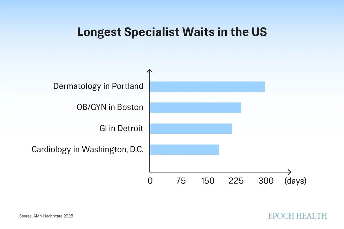 Across six specialties, appointment wait times continue to climb. The Epoch Times