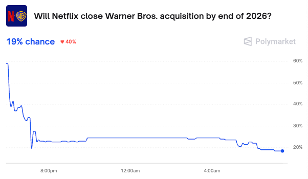 The latest Polymarket odds of whether the Netflix-WBD closes by the end of 2026 stand at 19%.