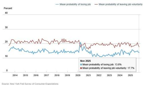 The perceived probability of losing one’s job fell 0.2% to 13.8%, marking the lowest reading this year. At the same time, the mean probability of leaving one’s job voluntarily also slumped to 17.7%, the lowest since February.