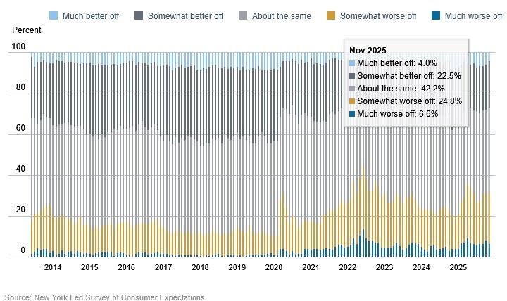 US consumer inflation expectations were stable in November while perceptions about households current financial situations deteriorated “notably” and perceptions about job prospects improved, according to the latest Survey of Consumer Expectations from the Federal Reserve Bank of New York.