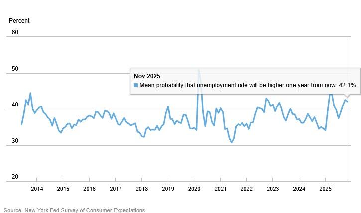 The survey showed consumers largely were more optimistic about the labor market in November than a month earlier, marking down the chances of a higher unemployment rate a year from now and reporting better odds of finding a job if they were to lose theirs.