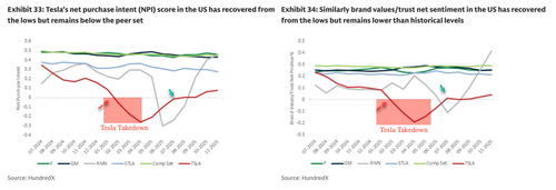 To visualize this brand-damaging campaign, we turn to Goldman analyst Mark Delaney’s latest note on the U.S. auto sector. In it, we find HundredX Net Purchase Intent data, a metric that estimates how likely a consumer (or group of consumers) is to buy a product or service within a given timeframe.