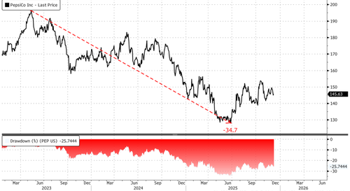 In markets, Pepsi shares remain locked in a bear market, down about 25% from their 2023 peak, though that’s an improvement from the roughly 35% drawdown seen this past summer.