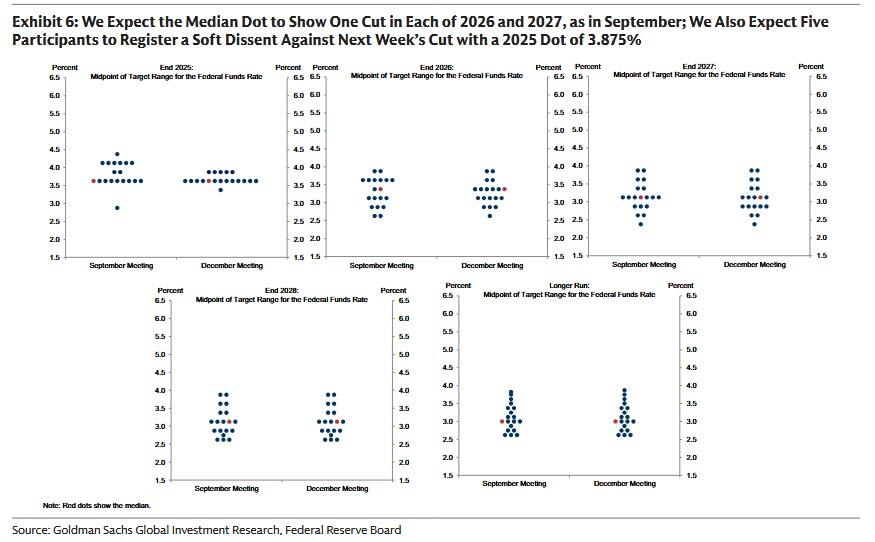 - The FOMC is widely expected to deliver a third consecutive 25bp interest rate cut to 3.5-3.75% at what will likely be a contentious December meeting. Most investors expect a hawkish cut, though this could be interpreted in a number of ways. It is not realistic to expect the FOMC to box itself in too much by signaling a very strong bias toward a pause in January because if the labor market is still actively softening at that point, a cut might be appropriate. In fact, participants will be even more uncertain than usual about what will be appropriate at the next meeting because we are now two employment reports behind schedule. Goldman