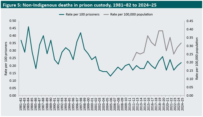 The death rate for non-indigenous prisoners was 0.22 per 100, compared to 0.15 for indigenous prisoners, which was slightly higher than the decade average of 0.13.