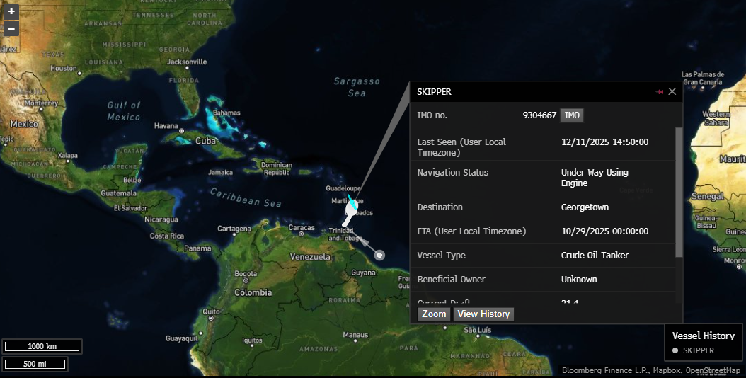 Bloomberg data shows the Skipper just north of Saint Lucia in the eastern Caribbean Sea. The vessel is listed as “engines underway” and heading northwest.