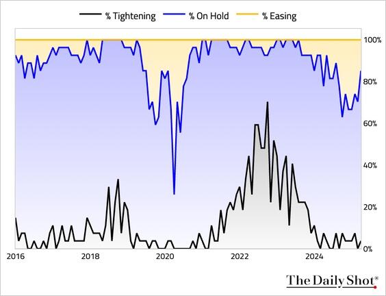 In fact, a largely unnoticed concern is that while global central banks were aggressively cutting rates over the last two years, they are now mostly all on hold.