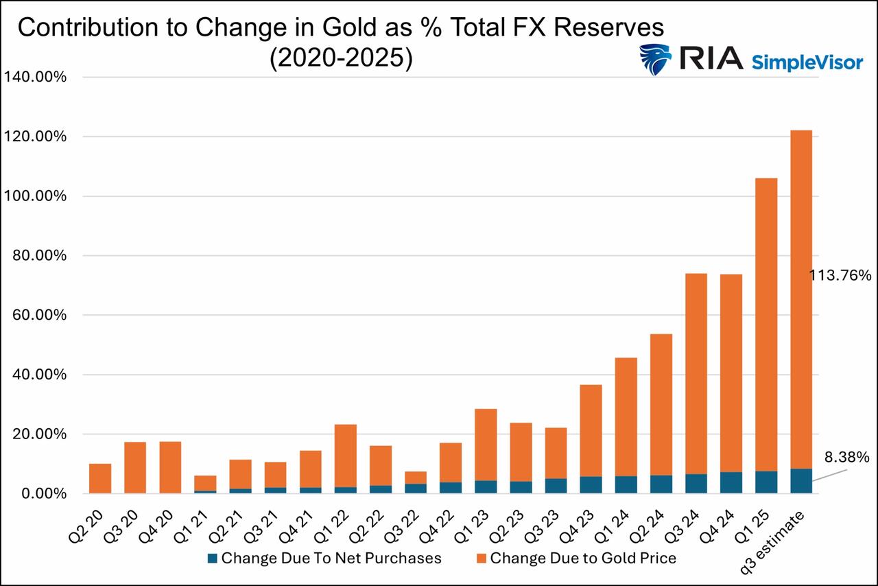 While the underlying drivers of the “double bubble” are multiple, this does not equate to a “this time is different” scenario. For example, while it is true that central banks have increased their purchases of bullion at a rate of approximately 1% annually over the last five years, these purchases are insignificant in terms of overall price appreciation. However, it has been retail investors, speculators, and professionals, drawn in by momentum, that have pushed gold prices sharply higher. That momentum chase, ETF inflows, and media coverage have caused investment dollars to flood into both gold and equity funds. As the BIS stated, ETF prices trading consistently above net asset value (NAV) is a clear sign of “strong buying pressure coupled with impediments to arbitrage.”