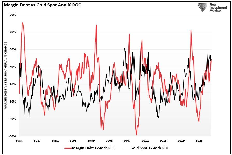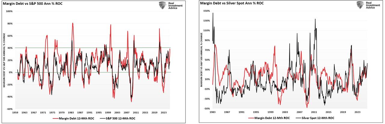Re-read that last sentence from the BIS. For investors with invested capital, this matters deeply. While many are chasing gold and precious metals like silver higher, along with high-risk equities, leverage, and speculative trading activities, this is essentially a function of momentum chasing. This is illustrated in the chart below, which shows the annual rate of change in margin debt (leverage) alongside the annual rate of change in both equities and silver.